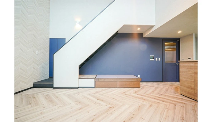 リビングの扉とクロスの色を合わせて、すっきりと感じられるように空間に統一感を持たせました。また階段下に畳コーナーを設置し、来客時にお客さまが快適に寛げるスペースを作りました。畳の下には引き出し収納を設けています。