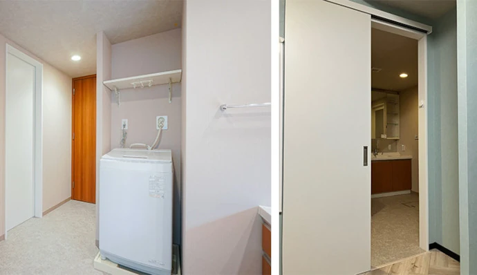 洗面室の内装には落ち着いたベージュのクロスを採用し、温かみのある空間を演出しました。洗面室からウォークスルークロゼットに直接出入りできるように新たな動線を設け、利便性が向上しました。