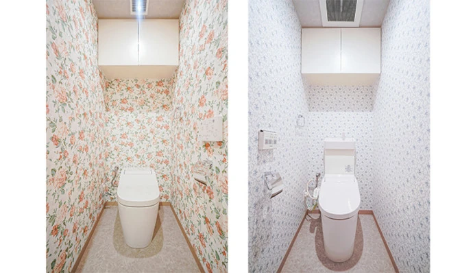 トイレ(1階・2階)には、花柄のクロスを使用し、華やかな空間を演出しました。