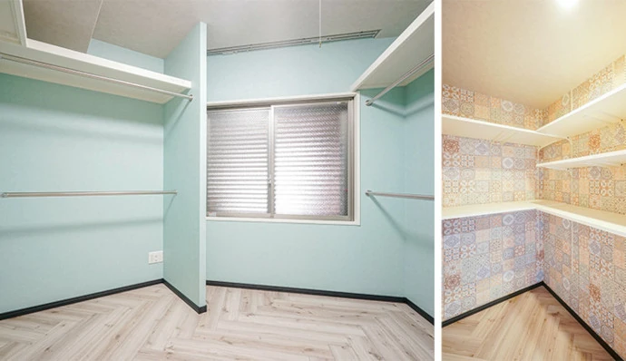 1階のウォークスルークロゼット(写真左)には、洗面室からの出入り口を設け、動線を改善しました。また、お二人分の衣類を十分にかけられるよう、パイプを上下2列で設計しました。壁紙はブルーを採用し、清潔感を感じられるスッキリとした空間に仕上げました。