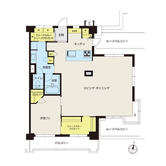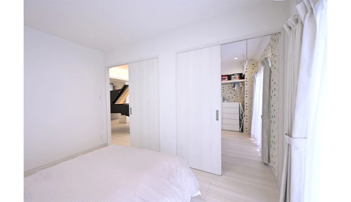 寝室として利用している洋室(1)とウォークスルークロゼットがつながっているため、起床時は、洋室(1)からウォークスルークロゼットに行き、身支度を済ませてからリビング・ダイニングに向かうこともできます。主なドアは引き戸を採用しているため、開け放すと家事をする際や、お掃除ロボットを稼働させる際もスムーズです。