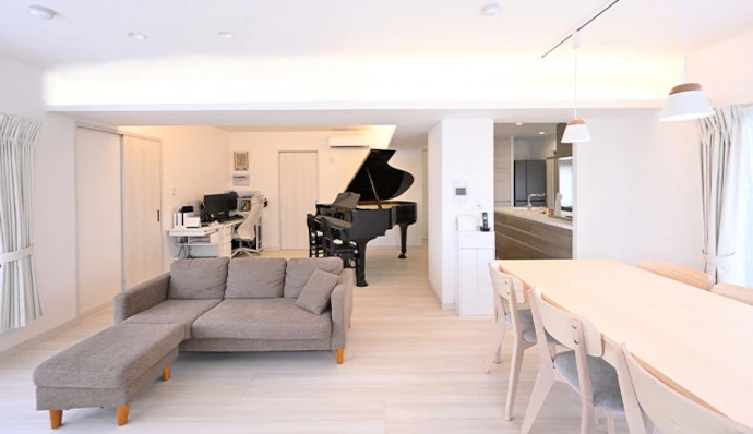 廊下をなくし部屋数を減らすことで、広々と使えるリビング・ダイニングが実現しました。グランドピアノが窓際に置いてあったもとの間取りでは、ピアノを守るために窓やカーテンを開くことができませんでしたが、直射日光の当たりにくい部屋の奥にピアノを移動し、壁の仕切りを減らしたことで、風や光が家中に通るようになりました。