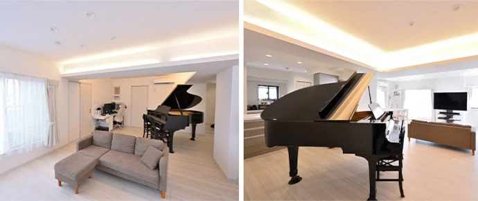 リビング・ダイニングの天井の梁には、間接照明を取り付けました。空間を圧迫し重く見えがちなマンションの梁が広がりのある印象に生まれ変わり、グランドピアノをより華やかに演出できるようになりました。グランドピアノを置くスペースは床を補強してあります。また、将来必要になったときにはグランドピアノを防音壁で囲むことも想定しています。
