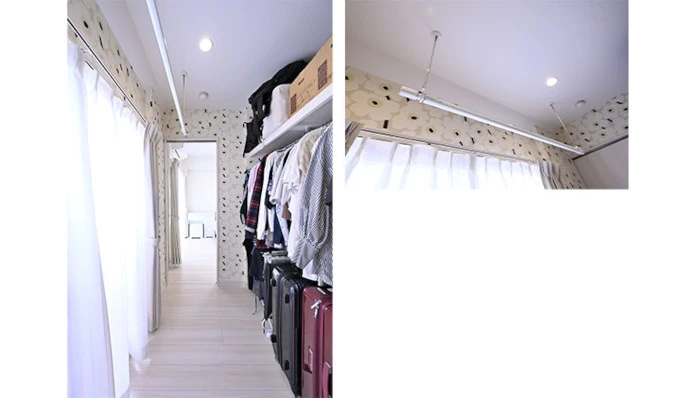 洗濯物を干すバルコニーに面したウォークスルークロゼット。取り込んだ洗濯物をそのままハンガーにかけて収納することが可能です。洗濯物の一時かけや雨の日の部屋干しなどに便利なランドリーパイプも設置。寝室として利用している洋室(1)とリビング・ダイニングに通じる2カ所の出入口が設けられており、家事のしやすい動線が確保されています。クロスは奥さまがお好きなフィンランドのファブリックメーカー「マリメッコ」の花柄のデザインを採用しました。広さが十分にあるため、衣類の他にスーツケースや季節の家電、趣味のアイテムなども収納することができています。