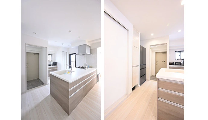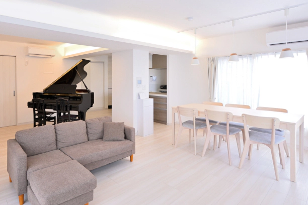 ご主人が生まれ育ったマンションを、ご両親から受け継いだSさまご夫婦。新築から30年近くが経っており、水回りや内装に傷みが生じていたことから、入居前にリフォームすることを決められました。また、ご主人のお母さまが大切にしてきたグランドピアノの置き場所を変更し、今後も持ち続けたいというご希望もありました。ご夫婦の要望を受け、プランナーは3LDKだった間取りを1LDKに変更するプランを提案。広くなったリビング・ダイニングに、グランドピアノを置くスペースを確保しました。また、広さを生かしてウォークスルークロゼット、ウォークスルーシューズクロゼットなど、ゆとりのある収納を設置し、リビング・ダイニングを中心に、水回りや収納スペースに行き来しやすい動線も実現しました。