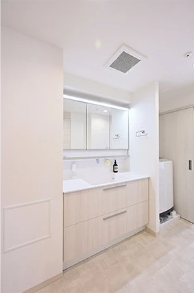採光や通風が十分でなかった既存の洋室(1)を撤去し、そのスペースに洗面室を設けました。広々とした空間を生かして、収納がたくさんついた洗面化粧台を採用。鏡の裏には洗面用具を、大容量の引き出しには洗剤などの買い置きを収納されています。