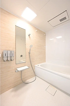 浴室は、白を基調にベージュのアクセントパネルで変化をつけました。掃除がしやすいように、シャワーフックなどのバスアクセサリー類は、機能とデザインがシンプルなものを選んでいます。