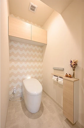 トイレは、丸みのあるデザインが特徴のタンクレストイレを採用。奥の壁だけ波模様のようなデザインの「マリメッコ」のクロスを採用することで、遊び心のある楽しい印象の空間に仕上げました。