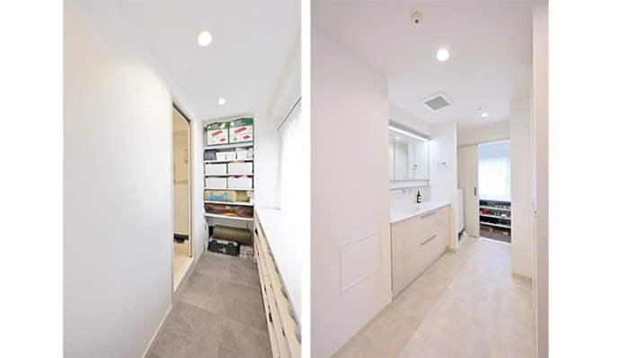 玄関脇には、既存の洋室(1)を撤去したスペースを利用して、ウォークスルーシューズクロゼットを設置しました。靴はもちろん、ご夫婦の趣味であるキャンプ用品も収納できています。洗面室に直結しているため、帰宅後すぐに手を洗ったり、汚れた衣類を洗濯機に入れたりすることができる点も便利です。
