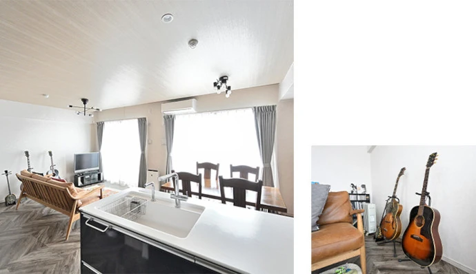 寝室として使用していた洋室(3)をリビング・ダイニングと一体化して「広いリビング・ダイニング」に変更。窓からの明るい光がたくさん入る、開放的な空間になりました。お部屋の一角にご主人の趣味のギターを飾るなど、インテリアを楽しめるようにもなりました。