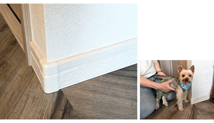 フローリングのように見える床材は、実はフロアタイル。愛犬の足腰の負担になりにくいよう、滑りにくいものを選びました。水滴などがついても拭きやすくふだんのお手入れも水拭きが可能です。壁の幅木の出隅部分にはコーナーキャップを使用しています。愛犬がトイレを失敗しても角が傷みにくいように工夫しています。