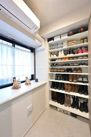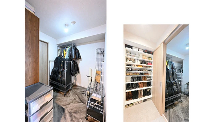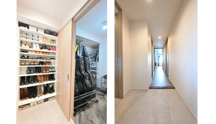 もとの間取りで洋室(2)だった部屋の一部を利用し、玄関からつながったシューズインクロゼットを設置。大容量の収納が設けられており、靴がお好きなご夫婦の靴をすっきりと収めることができました。靴を履いたまま出入りでき、愛犬のお出かけ時に使用するペットカートなども置けます。