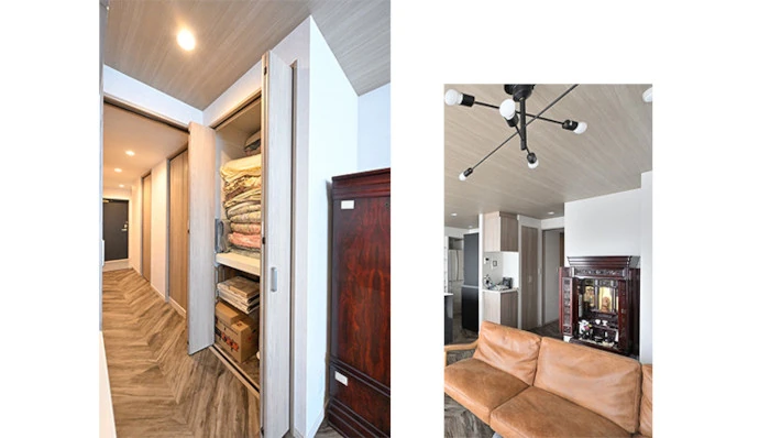 リビング・ダイニングの一角に普段は使用しない来客用の布団を収納するスペースを設置しました。折れ戸を採用しているので、左右両側を開けて中を見渡すことができます。隣にはお仏壇がぴったり収まるスペースを設けました。