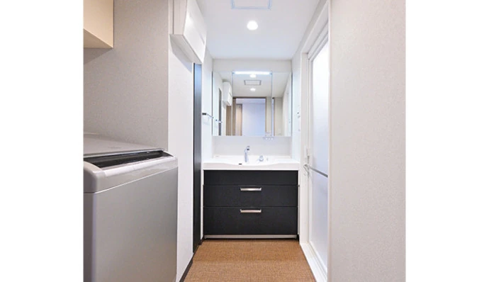 洗面室にはゆったりとしたボウルの大きさや、お掃除のしやすさも兼ね備えた洗面化粧台を採用しました。洗面化粧台の横にリネン類の収納も設置しています。床材は藤のような網目が特徴のフロアタイルを使用しています。意匠性が優れているうえに「肌触りが温泉の脱衣所のよう」と、ご夫婦のお気に入りとなりました。