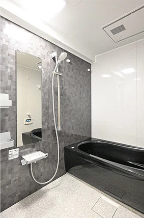 浴室はお部屋の雰囲気に合わせてブラック&ホワイトでシンプルな色使いにしました。以前のものよりも浴槽が一回り大きくなり、ゆったりと足を伸ばしてくつろぐことができるようになりました。