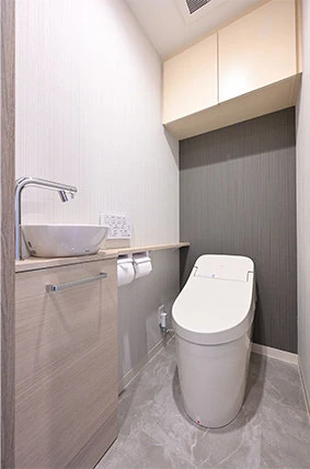 トイレは新たに手洗い器を設置して、ロータンクの便器を採用しました。壁にはチャコールグレーのアクセントクロスを張り、メリハリをつけました。