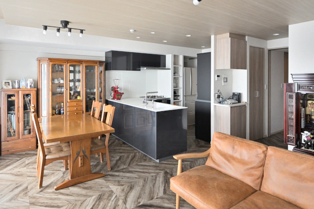 もともとの間取りは3LDKで、夫婦2人暮らしには部屋数が多すぎると感じられていたそうです。そこで間取りを1LDK+S(納戸)+SIC(シューズインクロゼット)に変更。リビング・ダイニングを拡張し、使いやすい場所に新たな収納スペースを設置するなど、ご夫婦の暮らしにより適した間取りをご提案しました。床材は愛犬の足腰の負担になりにくいよう、滑りにくく手入れがしやすいフロアタイルを全室に敷いています。ご夫婦にご満足いただけたのはもちろん、愛犬たちにも優しい住まいになり大変嬉しく思っています。