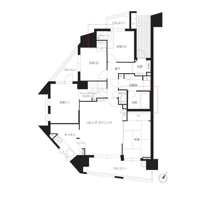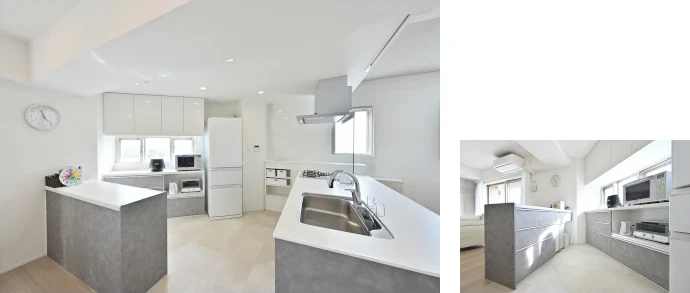 壁付けで半個室状態だったキッチンをオープンキッチンに変更。さらに既存の洋室(1)のスペースをリビングにつなげ、角住戸ならではの窓の多さを生かした、より明るく広々とした空間を実現しました。