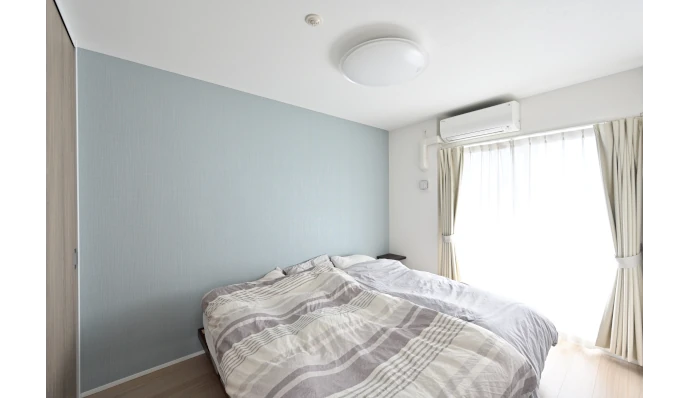 和室は洋室(1)へと変更し、ご家族の寝室として活用されています。リビング・ダイニングと隣接しているためお子さまの様子をすぐに確認することができ、一人でお昼寝をしていても安心して過ごせます。壁には淡いブルーのアクセントクロスを施し、優しくリラックスできる雰囲気を演出しました。
