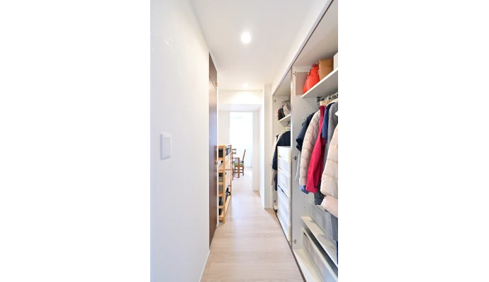 ウォークスルークロゼットは、既存のものをそのまま生かし、出し入れのしやすいオープン収納に変更しました。帰宅後は廊下からウォークスルークロゼットを経由してダイニングに向かうことができます。