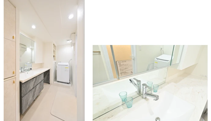 洗面化粧台は、カスタムメイドができる製品を採用し、横に長い洗面カウンターを設置しました。カウンター部分が広いため、洗濯物をたたむスペースや入浴時の着替え置き場として活用されています。