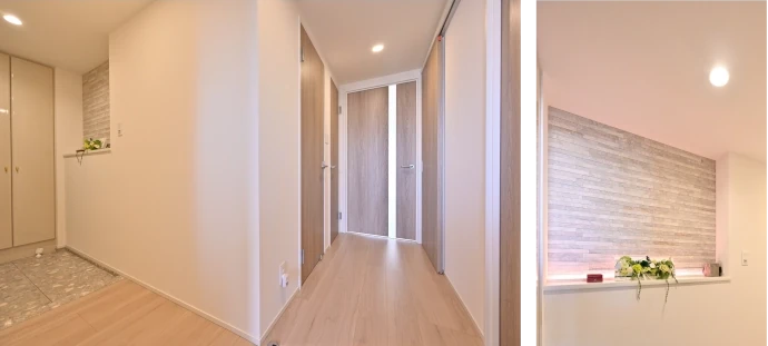 家の第一印象を決める玄関には、壁の一部に石目調のエコカラット※1を張り、より印象的に演出しました。建具やフローリングなどの内装は、グレージュを中心に明るく落ち着いた印象にまとめました。