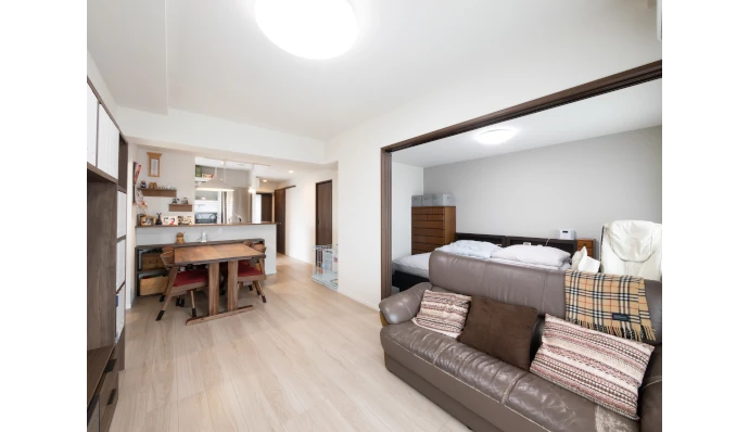 廊下からリビング・ダイニングに続くドアを開けた時に正面にあった物入を撤去し、広い動線を確保することで、より開放的でスムーズに移動できる空間を実現。さらに、キッチンの横幅をコンパクトなタイプに変更することで、より快適な動線を確保しました。和室は洋室へとリフォームし、建具も襖から3枚連動引き戸へ変更。扉を開けるとリビング・ダイニングと一体感のある広々とした空間が広がります。