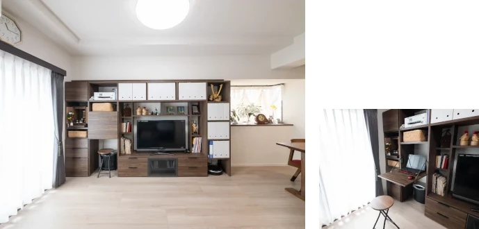 リビング・ダイニングには新たに大容量の収納を設け、リビングで使用する小物をすっきりと整理できるようにしました。さらに、ワークスペースを備え、お掃除ロボットの収納スペースも確保。機能性と快適さを両立させた、すっきりと暮らしやすい空間に仕上げました。