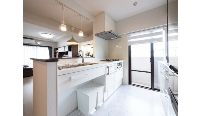 キッチンのゴミ箱は、シンク下のスペースに収納できるように配置を変更。空間にアクセントを加えるため、フローリングを汚れに強い白色のフロアタイルに変更しました。