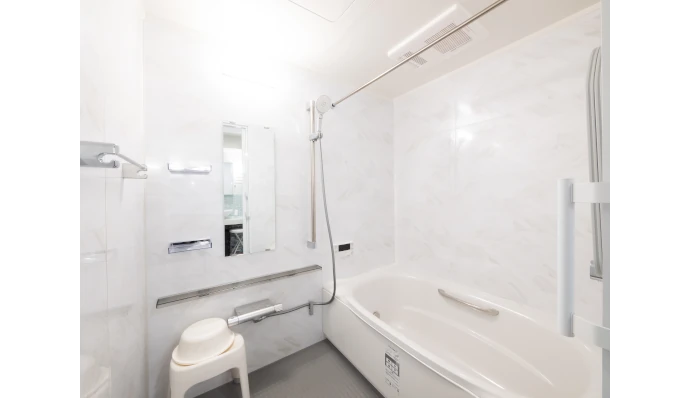 浴室には石目調のパネルを採用し、明るく清潔感のある空間を演出しました。さらに、お手入れのしやすさを考え、カウンターや収納棚は取り外して洗える仕様のものを設置しました。