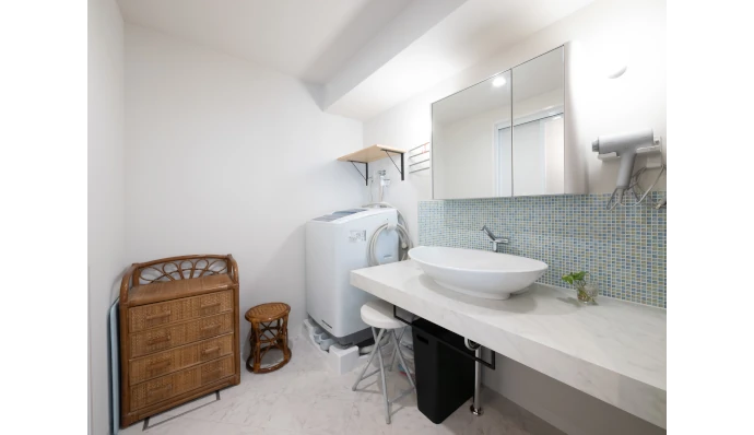 洗面化粧台は造作家具で設計し、壁面にはガラスのモザイクタイルを採用しました。カウンターの下部にはタオル掛けを設置し、使い勝手を向上。洗濯機の上部には棚を設け、リネン類や洗剤などを便利に収納できるようにしました。