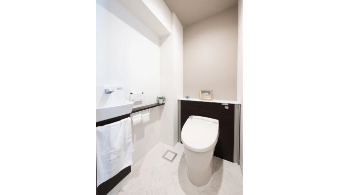 トイレは既存の本体をそのまま使用。背面キャビネット上にあった手洗い器を撤去し、スペースを広げて、側面に手洗い器付きカウンターを新設しました。その結果、使い勝手が向上し、より快適な空間に。さらに、落ち着いたモカグレーのアクセントクロスを取り入れ、穏やかで心地よい雰囲気に仕上げました。