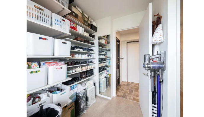 玄関には靴を履いたまま出入りできる土間を新たに設けました。さらに姿見を設置したことで、お出かけ前に身だしなみをチェックできます。また、掃除機の充電用コンセントも計画的に配置しました。可動棚を取り入れ、収納するアイテムに合わせてスペースを自由に調整できるようにしました。