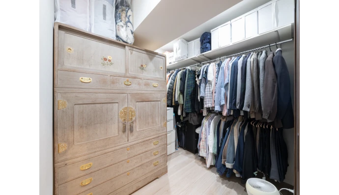 新たに設けたウォークインクロゼットには、大切にされている桐箪笥を置けるスペースを確保しました。またポールを増設し、ご夫婦の洋服を1カ所に収納ができるようになりました。