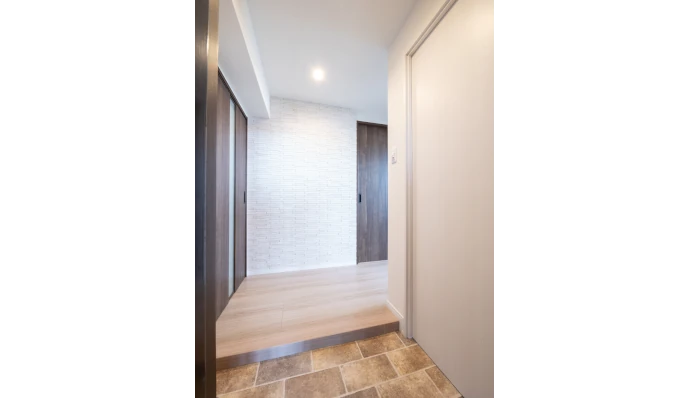 玄関には新たに土間を設計したため、下足入れをなくしました。床には素焼きのレンガ調のフロアタイルを採用し、正面の壁にはエコカラット※1を施すことで、華やかで上質な空間を演出しました。