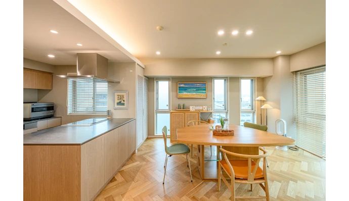海を感じる立地に惹かれて、築11年の中古マンションを購入したNさまご夫妻。広々としたリビング・ダイニングと、お二人の好みに合ったインテリアを実現するために、水回り設備や内装、間取りのリフォームを決意されました。リビング・ダイニングを広く取りたいというご要望に応じ、3LDKだった間取りを1LDK+ウォークインクロゼットに変更するプランを提案。インテリアには、ブルーやグリーン、ホワイトなどのカラーを取り入れ、海辺の心地よさを感じられるさわやかな住まいに生まれ変わりました。