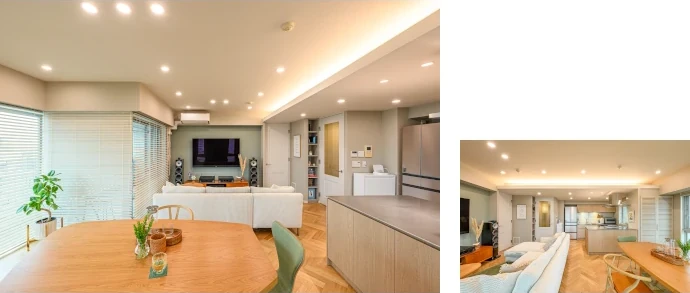 もともと洋室(3)だったスペースにキッチンを移動することで、広々としたリビング・ダイニングを実現しました。奥さまが多くの時間を過ごされるダイニングテーブルまわりに、特にゆとりを持たせたいというご要望に応え、家具の配置も考慮しながらプランニングを行いました。個性的なデザインのダイニングテーブルが、空間におしゃれなアクセントを添えています。