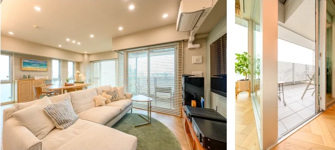 リビングの掃き出し窓を開けると、遠くに海が見えるバルコニーへと続きます。バルコニーの床にタイルを敷き詰めることで、アウトドアリビングとしても活用でき、ご主人さまのお気に入りのくつろぎスペースになりました。