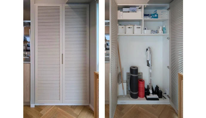 ダイニングの一角に設けた収納は、ブラインドの横ラインと調和するよう、ルーバー付きの扉をオーダーメイドで製作しました。ルーバー仕様により通気性を確保しつつ、掃除道具などを縦置きで収納できるゆとりあるスペースを備えています。