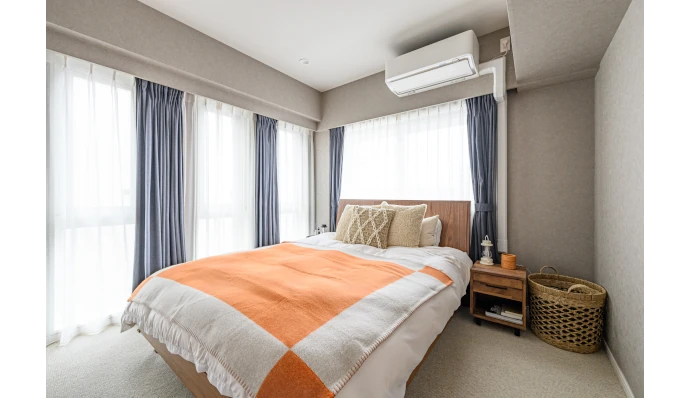 洋室(1)には厚手で柔らかなカーペットを敷き、落ち着いた色合いのインディゴブルーのカーテンを選ぶことで、ほかの部屋とは異なるリラックス感を演出しました。また、カーテンを開けた時に、白色とインディゴブルーを交互に配置することで色のアクセントが生まれ、デザイン性のある空間を演出しました。