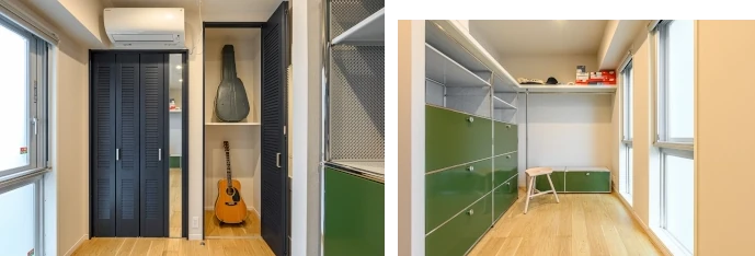 衣類はウォークインクロゼットにまとめて収納できるようにしました。また自由度を持たせるために棚と一部のハンガーパイプのみ造り付けとし、お客さまご自身で後から引き出し式の収納ユニットを設置していただけるようにしました。また、ご主人さまが大切にされているギターを収納するためのスペースもしっかりと設けました。