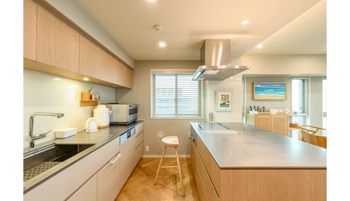 キッチンはオーダーメイドでオリジナルのものを製作しました。2列型のキッチンにすることで、広々とした作業スペースを確保し、ゆとりをもってお料理ができるように工夫しています。コンロ側のワークトップ(天板)の奥行きは、1,050mmと一般的な対面キッチンよりも大きめに設計し、しっかりと存在感のある印象に。ワークトップにはバイブレーション仕上げのステンレスを採用しています。扉の面材には、木目調と無地のホワイトベージュの2色を組み合わせて配置することで視覚的な変化を加えました。