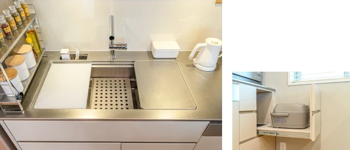シンクは、食材や食器を洗うだけでなく、食材を切ったり、水切りや盛り付けがしやすくなるように工夫された仕様のものを採用しました。また、炊飯器置き場は使用する時だけ引き出せるスライドタイプにするなど、収納パーツにも細かな配慮をし、使い勝手を考えた設計を取り入れています。