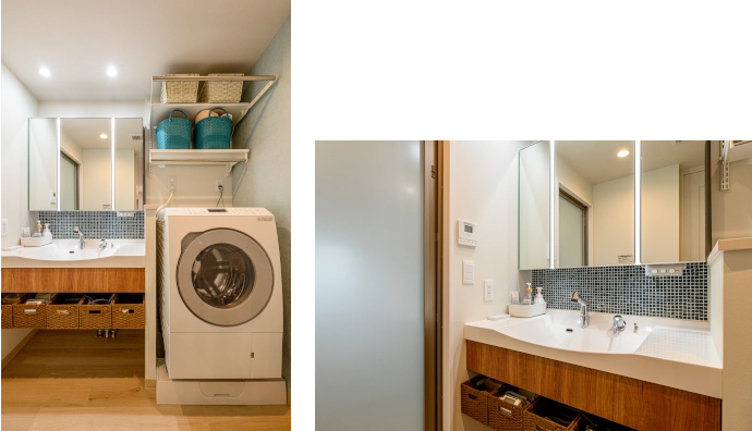 洗面室には、美しい形状のボウルが特徴の洗面化粧台を設置。インテリアの印象に合わせて、奥にブルーのガラスモザイクタイルをあしらいました。