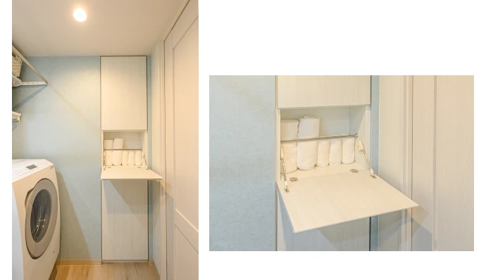 洗面室のリネン庫は、限られた奥行きであるため、タオルを丸めて縦に並べられるようにしています。さらに、扉はフラップ扉とし、洗濯物を畳む台や、入浴時の着替え置き場としても使用できるように工夫しました。