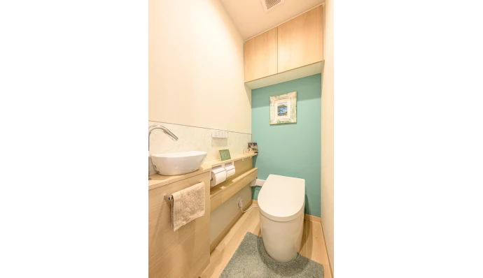 トイレには、タンクレストイレと手洗い器を設置しました。奥の壁のブルーグリーンのクロスがさわやかなアクセントになっています。