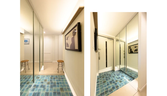 玄関の床には、ターコイズカラーをベースとした焼きむらが美しいタイルを敷き、印象的な玄関になりました。玄関収納は、外出時に使用する姿見を兼ねて、ミラー張りの扉を製作。空間が広がって見え、視覚的に奥行きを感じさせる効果もあります。照明は足元(玄関収納下)と天井(壁面のブラケット)の間接照明を採用し、柔らかい印象をつくっています。