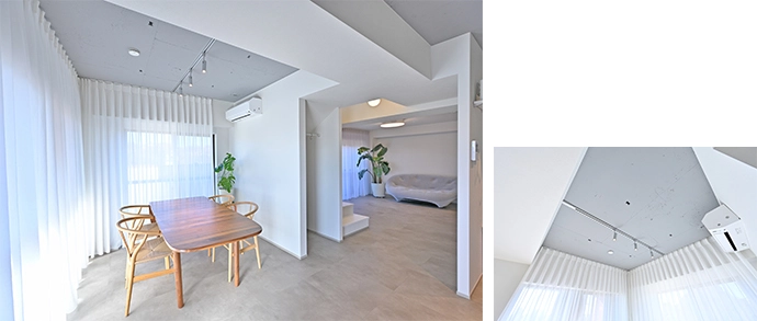 階段を挟んで、リビングの反対側には、ダイニングが広がっています。1階のインテリアは、ご主人さまのご要望に応じ、クールでミニマムな印象にコーディネート。床にはモルタル調のフロアタイルを選び、都会的な雰囲気に仕上げました。天井はコンクリートの質感を生かしてグレーにペイント(画像右)。床と天井を同系色でまとめることで、統一感をもたせました。