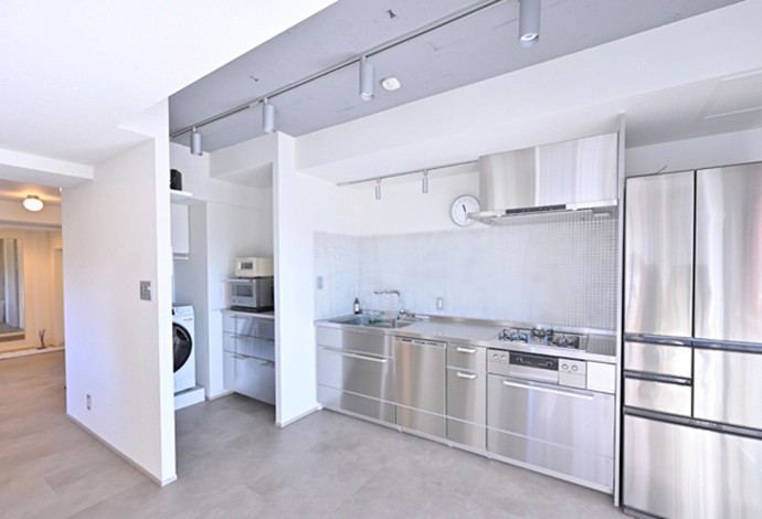 キッチンには、ステンレスの輝きが美しい壁付けのシステムキッチンを設置しました。面材だけではなく、キャビネットの内部にもステンレスが使われており、汚れ・カビ・臭いに強く耐久性に優れていることが特徴の製品です。壁には、白いモザイクタイルを採用し、無機質な雰囲気の中にも柔らかさを演出。キッチンの隣には洗濯機や調理家電を置けるスペースを設け、動線をスムーズにして家事を効率よくこなせるように工夫しました。