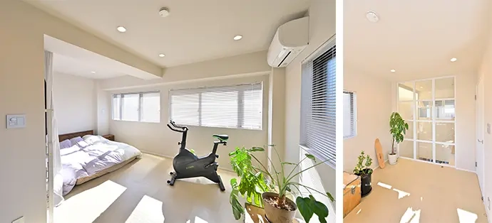 洋室(1)は、既存の洋室(2)と隣接していた和室を一続きの空間にし、広くて明るい寝室にしました。壁の一部には室内窓を設け、奥の空間にも光が届くよう工夫しています(画像右)。